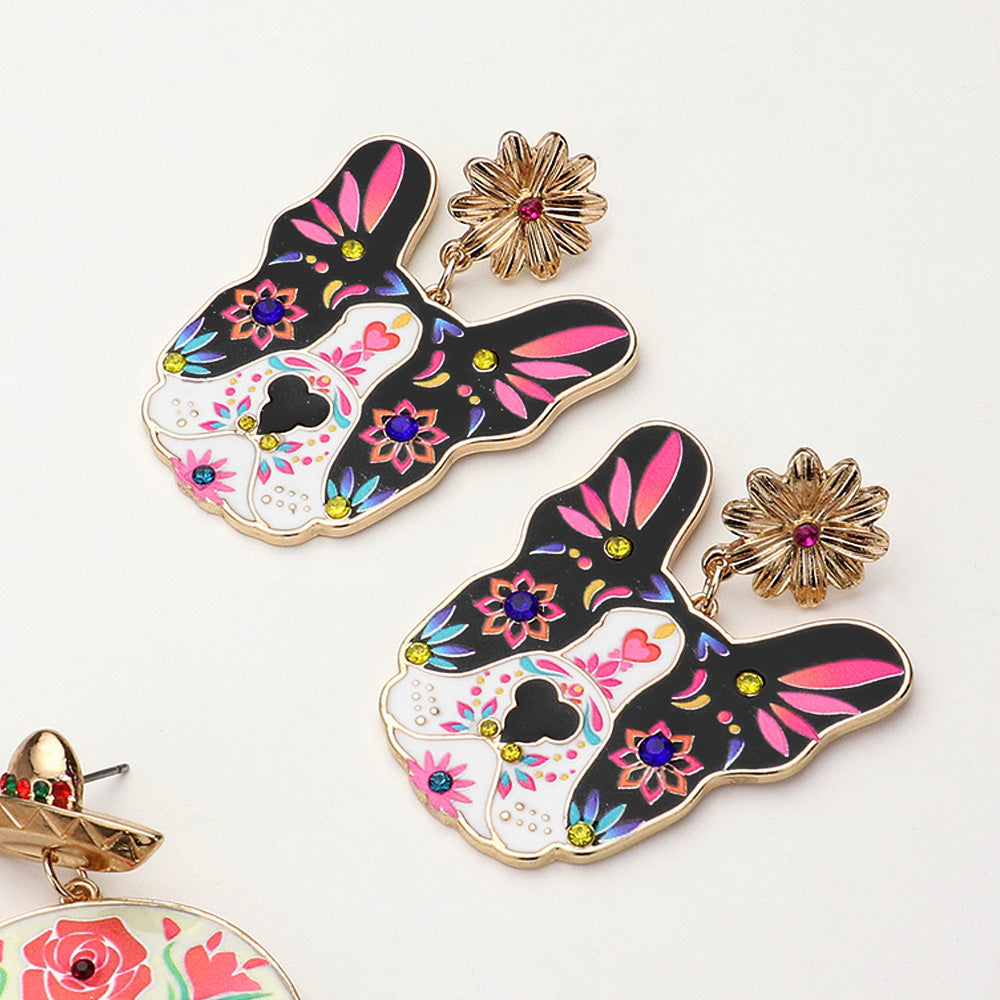 iLLASPARKZ Stone Pointed Enamel Sugar Skull Frenchie Bulldog Dangle Earrings