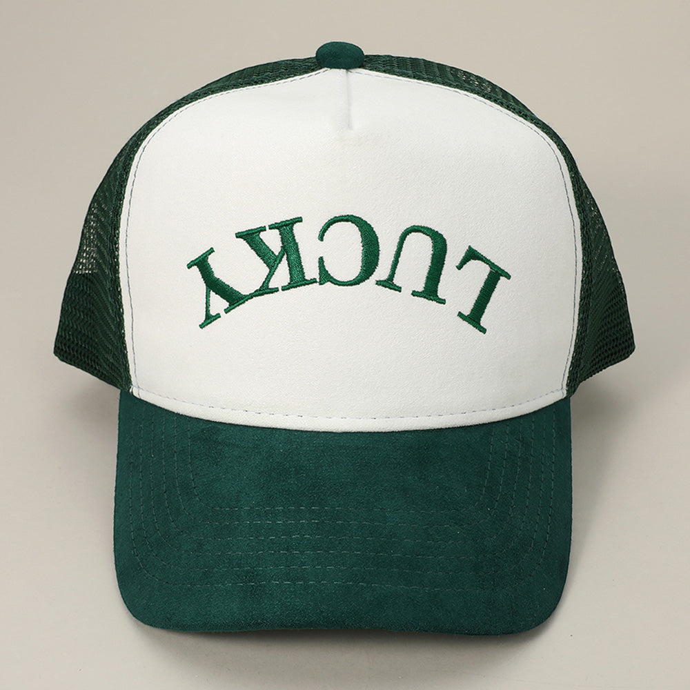 iLLASPARKZ Upside Down LUCKY Message Embroidered Mesh Back Suede Trucker Cap