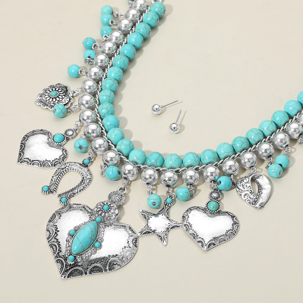 iLLASPARKZ Western Boho Turquoise Stone Embellished Heart Star Horseshoe Charm Station Statement Necklace