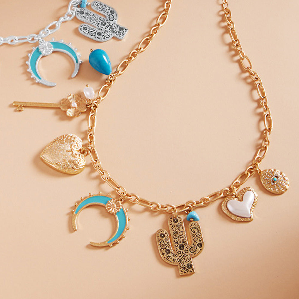 iLLASPARKZ Western Cactus Pearl Heart Metal Flower Key Crescent Charm Station Necklace