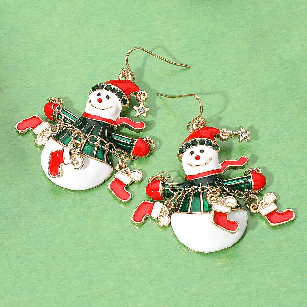 Add festive cheer to your holiday wardrobe with these adorable snowman earrings featuring colorful stocking charms and sparkling details. Perfect for Christmas parties or gifting, these lightweight statement earrings bring a joyful, whimsical touch to your seasonal style.