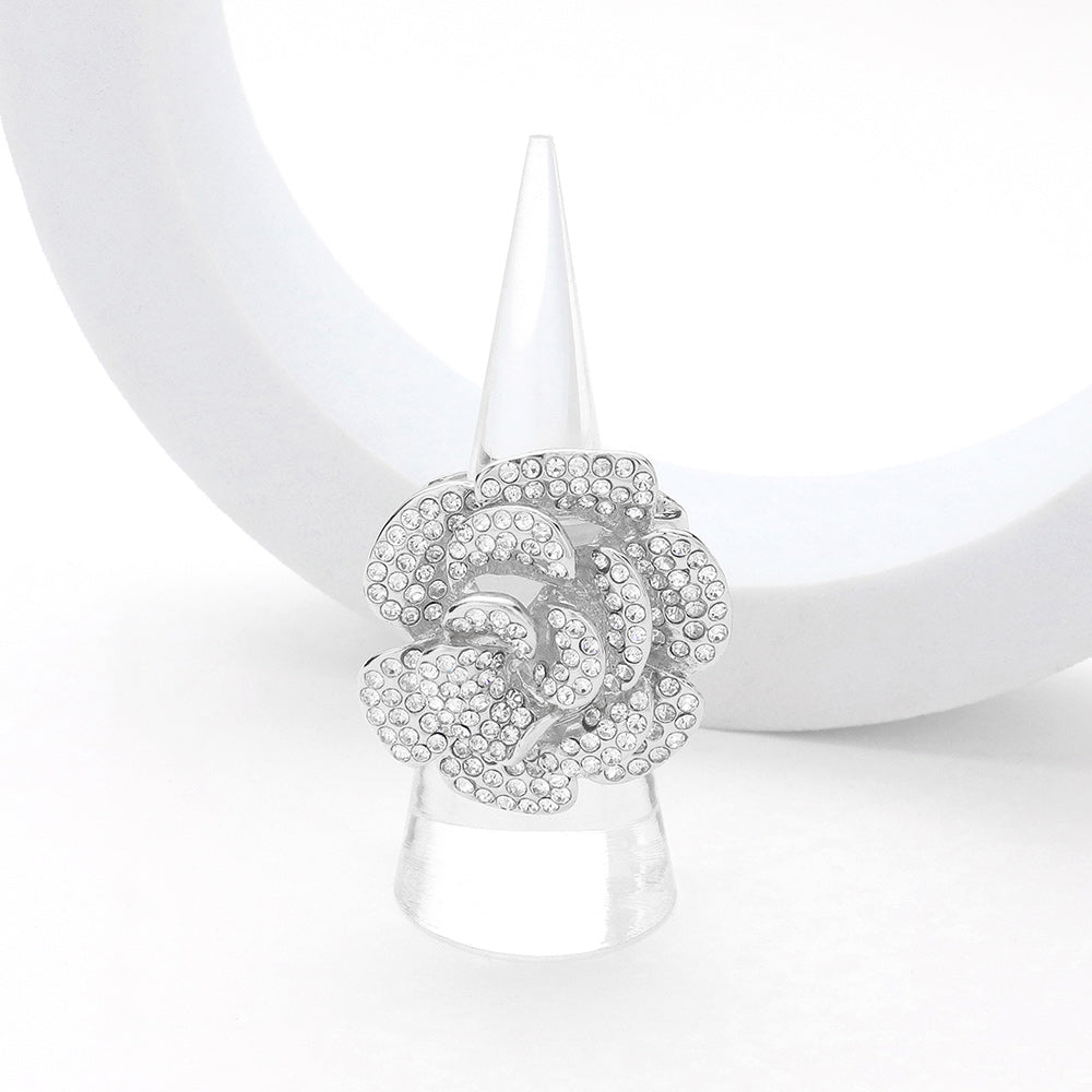 Stunning floral cocktail ring adorned with shimmering crystals. Perfect for special occasions or evening wear. Adds a glamorous touch to any outfit with its bold and elegant design.