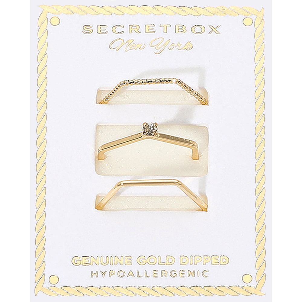 Stylish 3-piece gold dipped ring set from Secret Box NY. Features a crystal accent, minimalist bands, and hypoallergenic design. Ideal for stacking or gifting.