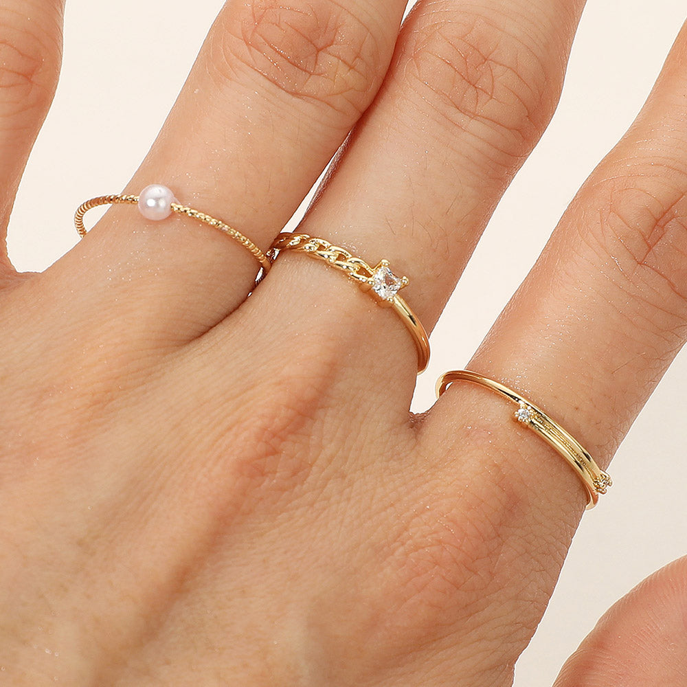 Chic 3-piece gold dipped ring set by Secret Box NY featuring pearl, crystal, and textured designs. Hypoallergenic and stylish, ideal for daily wear or gifting.