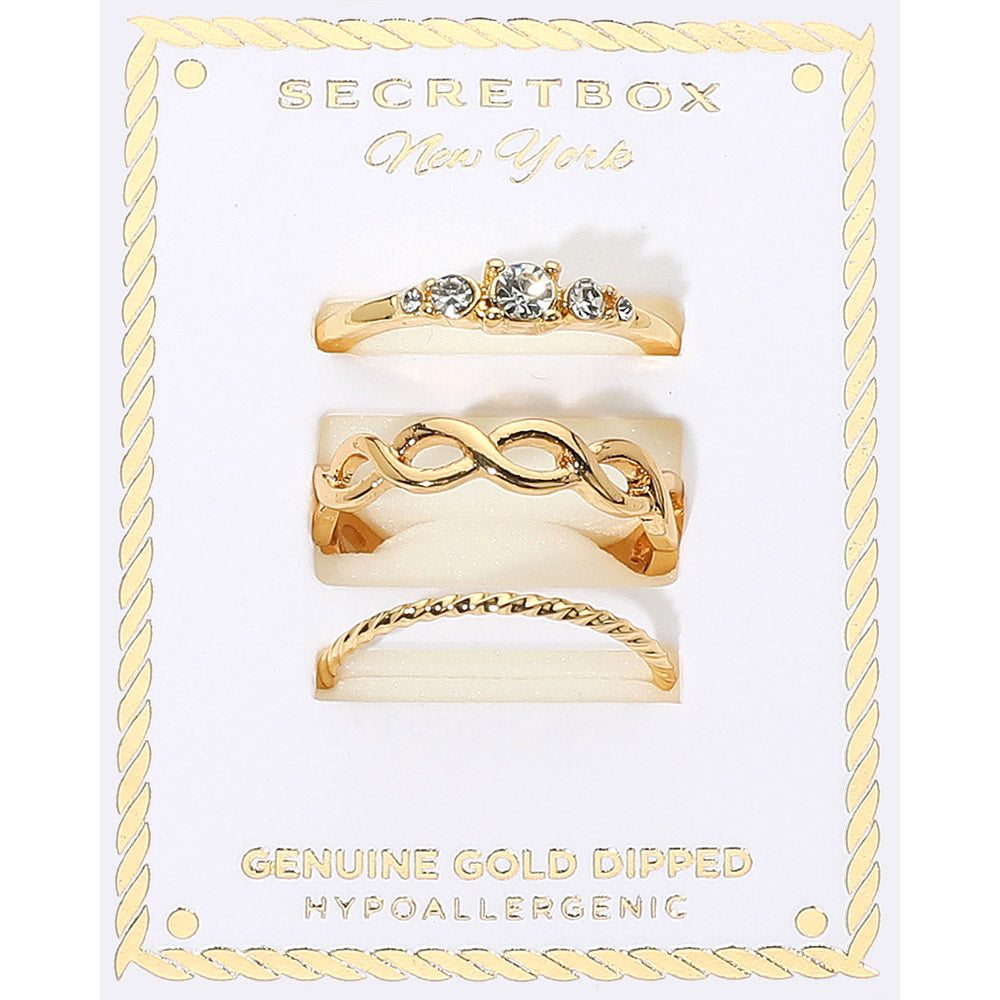 Elegant 3-piece gold dipped ring set by Secret Box NY. Includes crystal, twist, and rope designs. Hypoallergenic, stylish, and perfect for everyday or special occasions.