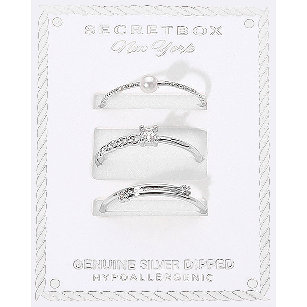 Chic 3-piece silver dipped ring set by Secret Box NY featuring pearl, crystal, and textured designs. Hypoallergenic and stylish, ideal for daily wear or gifting.