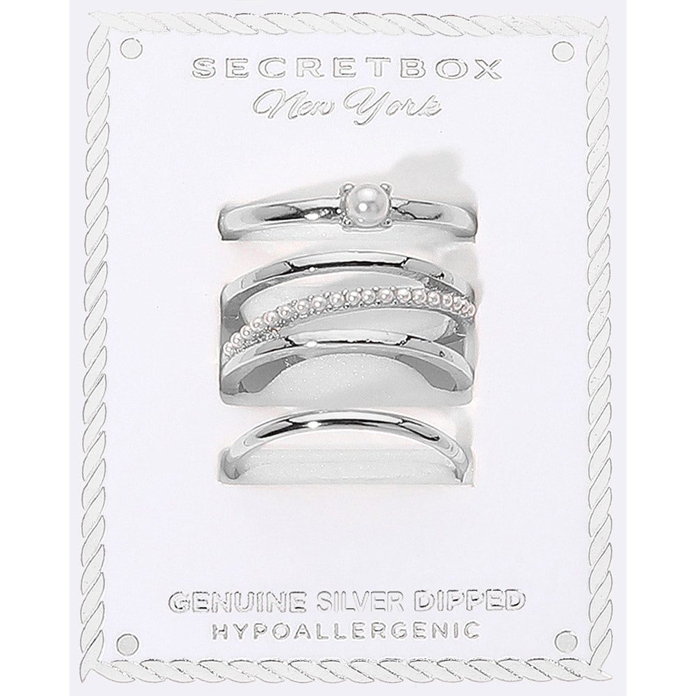Chic ring set with pearl and minimalist bands. Crafted with genuine silver dipped material, hypoallergenic, ideal for stacking or wearing solo. Perfect accessory for everyday or special occasions.