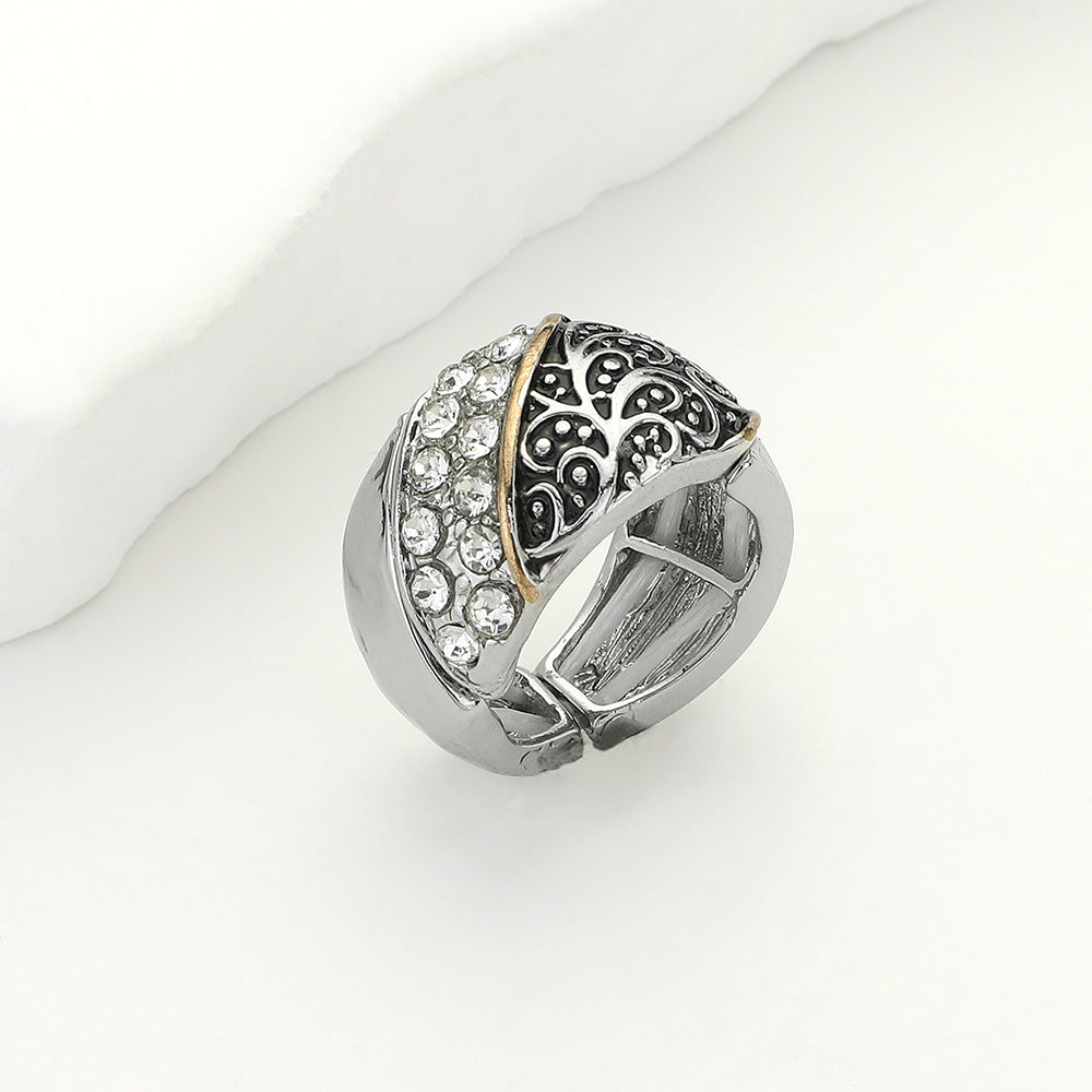 Striking dome ring featuring intricate filigree patterns and shimmering crystal accents. A bold yet elegant accessory that adds a refined touch to both everyday and formal looks.