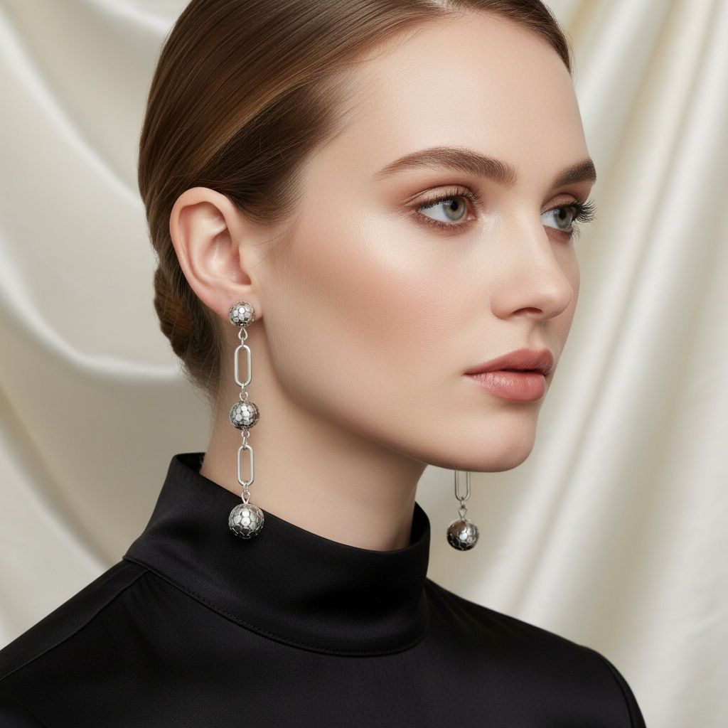 Dangle Silver Linked Mesh Ball Long Drop Earrings