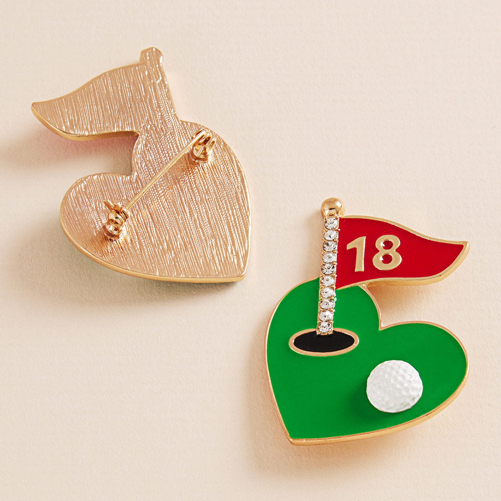 Charming enamel pin featuring a heart-shaped green, golf ball, and rhinestone flag detail. Perfect for golf lovers to decorate bags, hats, or jackets. Fun gift idea.