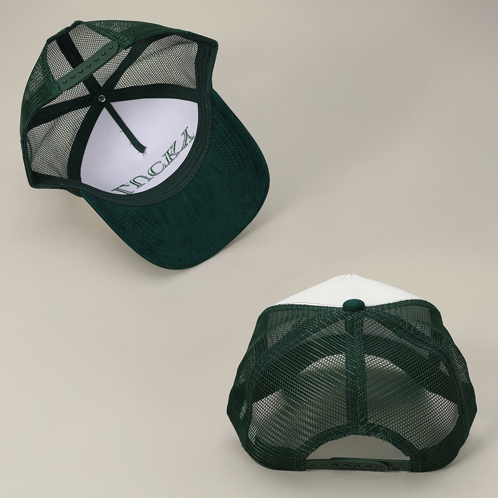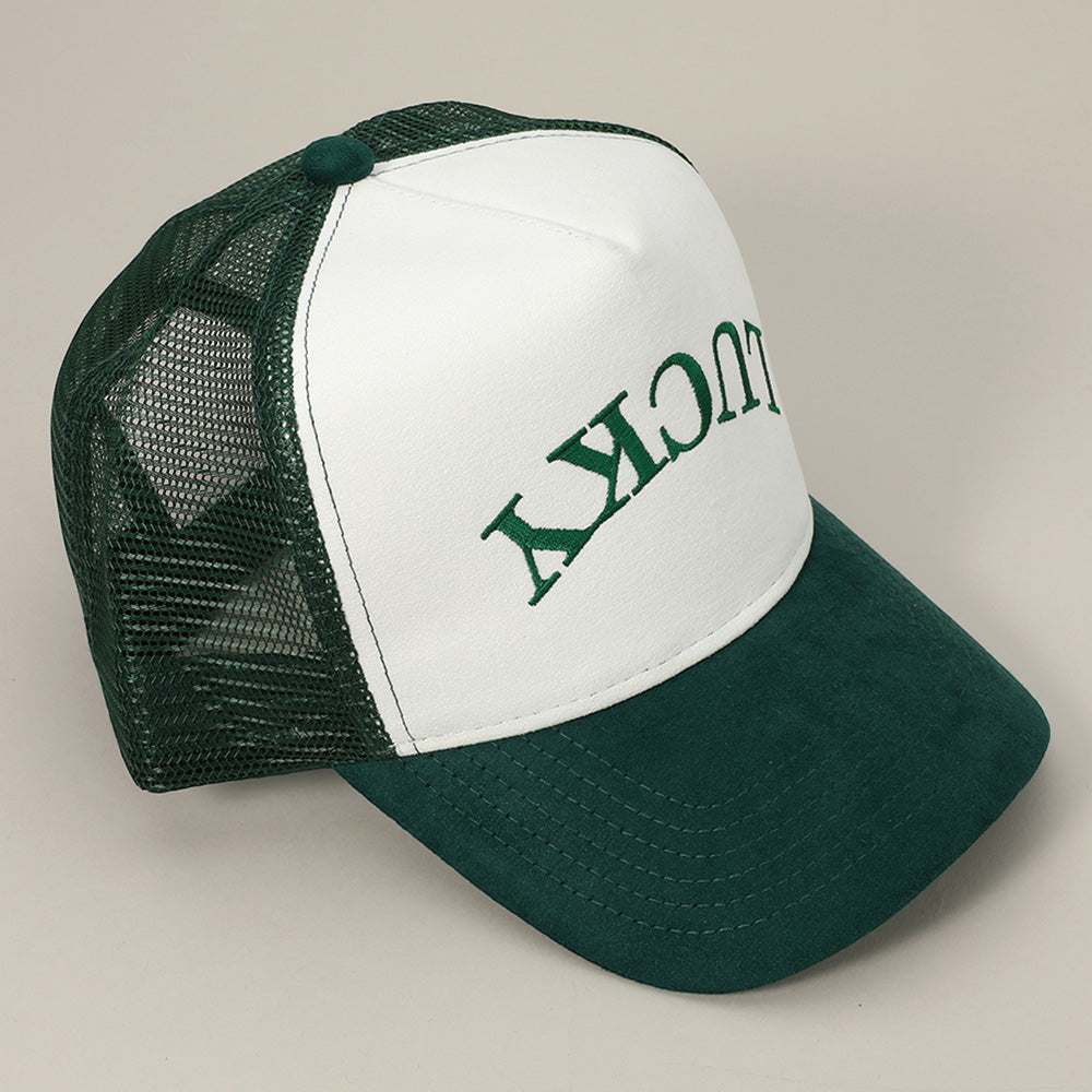 iLLASPARKZ Upside Down LUCKY Message Embroidered Mesh Back Suede Trucker Cap