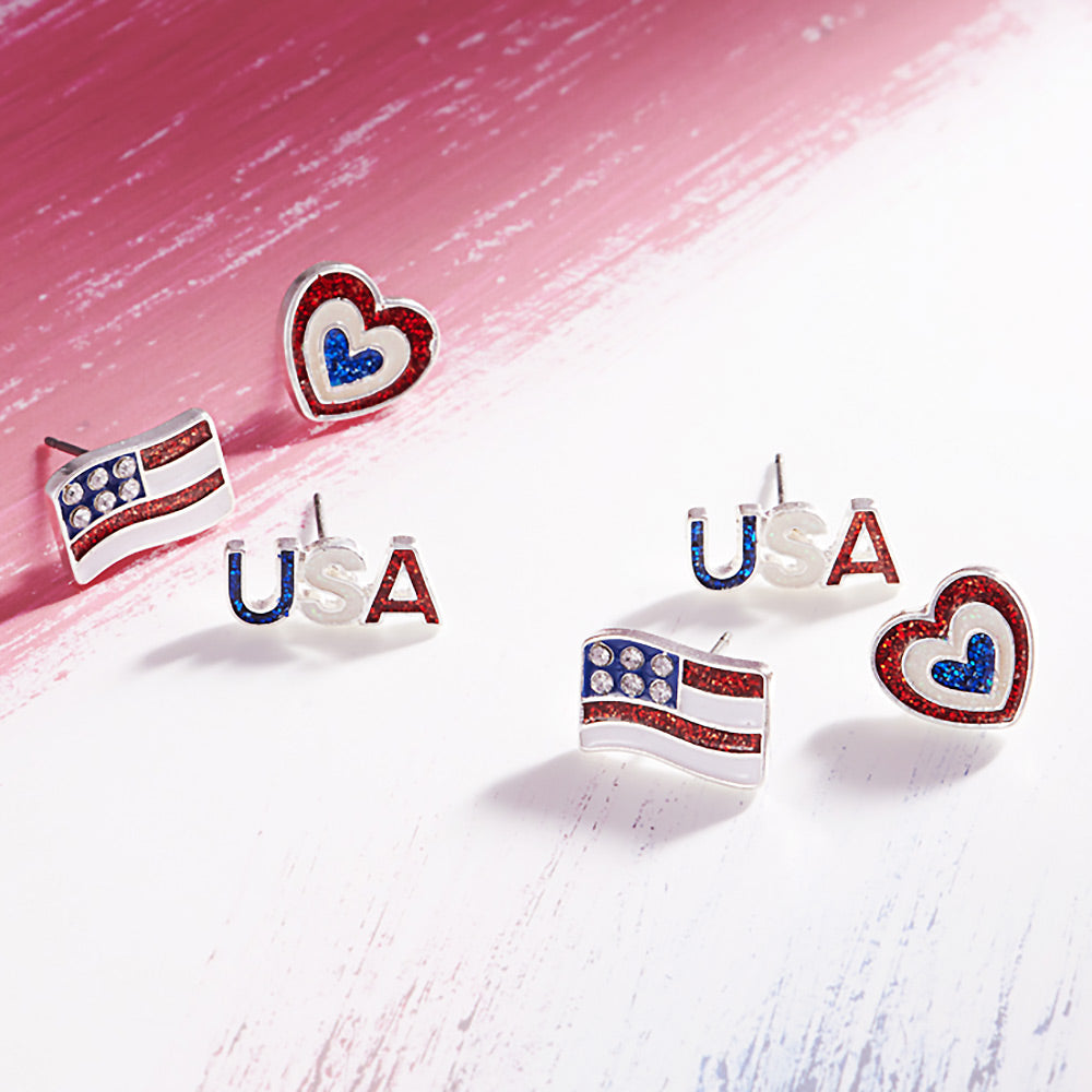 iLLASPARKZ 3Pairs - Enamel American USA Flag Heart USA Message Stud Earrings Set