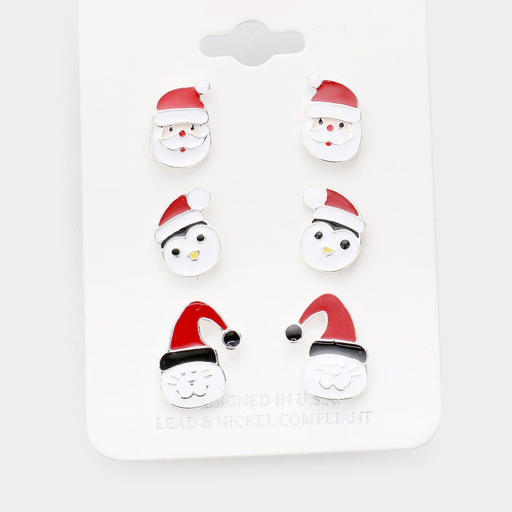 iLLASPARKZ 3Pairs - Enamel Santa Claus Penguin Cat Stud Earrings