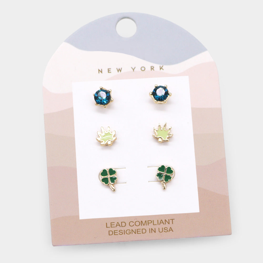 iLLASPARKZ 3Pairs - Round Stone Enamel Leaf Clover Stud Earrings