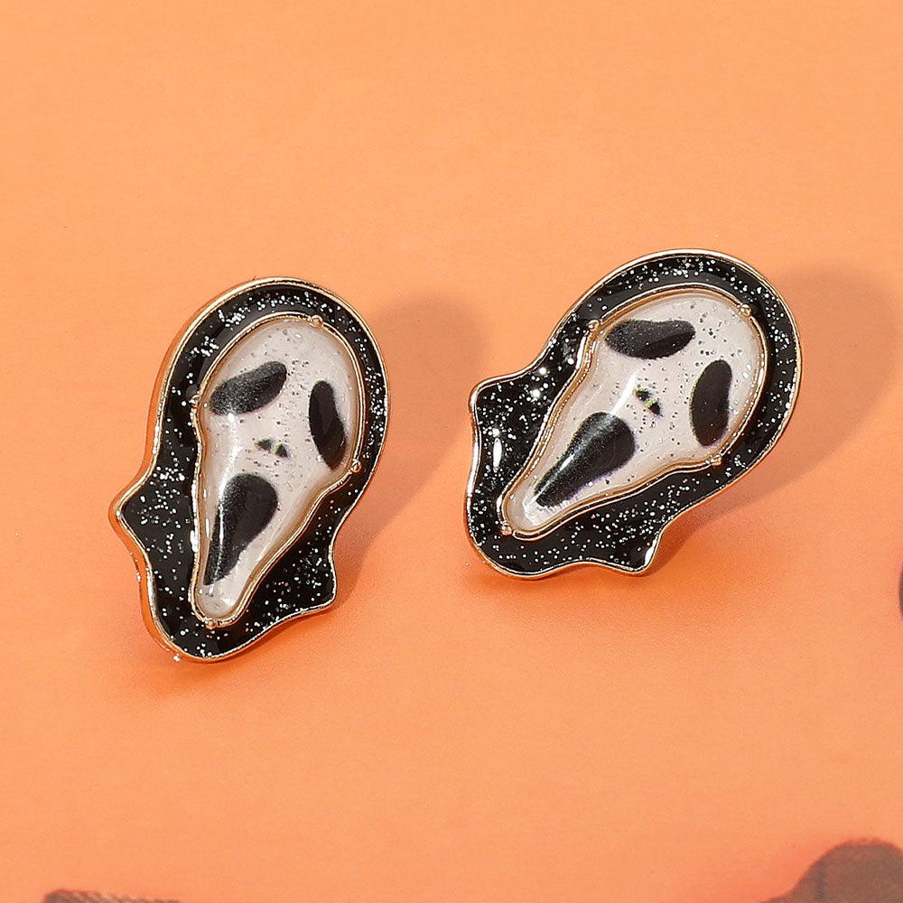 Spooky ghost face stud earrings with glitter detail, perfect for Halloween costumes, parties, or eerie seasonal style. Lightweight and eye-catching.