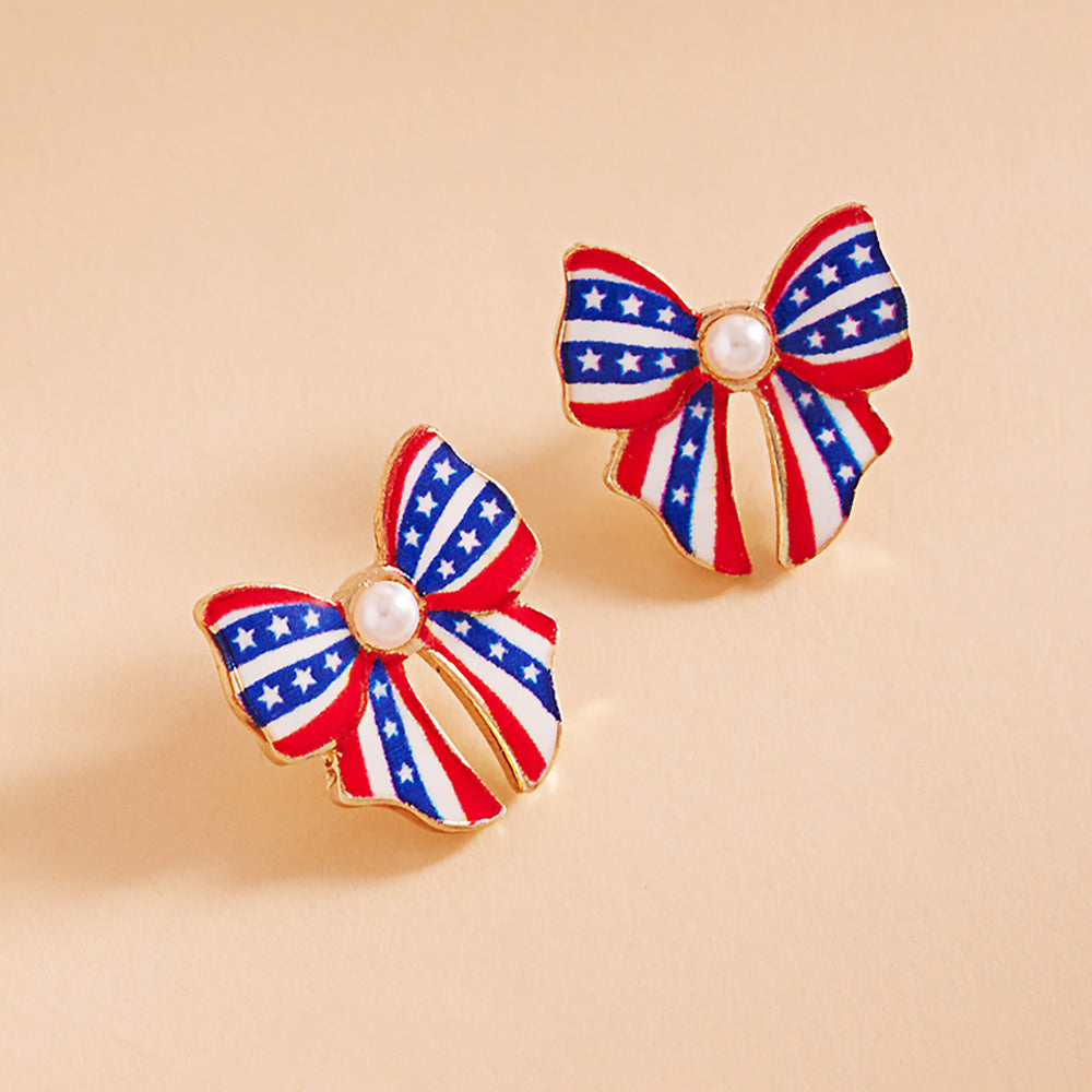 Show your patriotic spirit with these charming bow stud earrings featuring a star design and center gem. A fun accessory for national holidays, parades, and festive events, they add flair to any outfit with a bold yet elegant style.