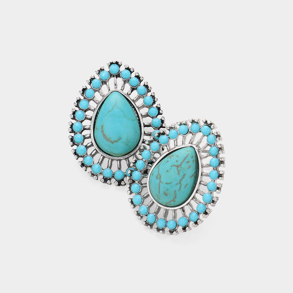 Teardrop stud earrings with vibrant turquoise stones and beaded silver trim. A bold yet classic accent for boho and Southwestern styles.