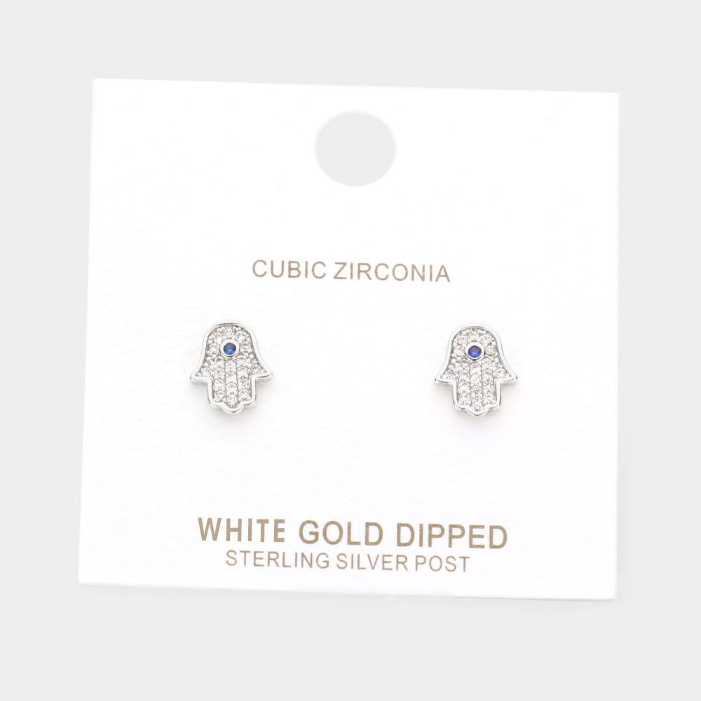 iLLASPARKZ White Gold Dipped CZ Embellished Hamsa Hand Stud Earrings