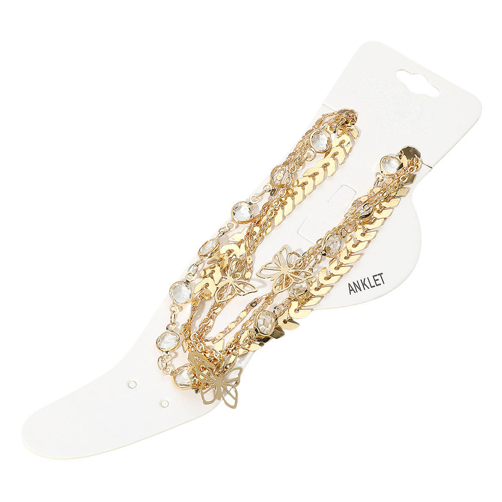 Add a whimsical touch to your look with this 4-piece anklet set featuring butterfly charms, crystal accents, and sleek gold-toned chains. Ideal for everyday elegance or vacation vibes.