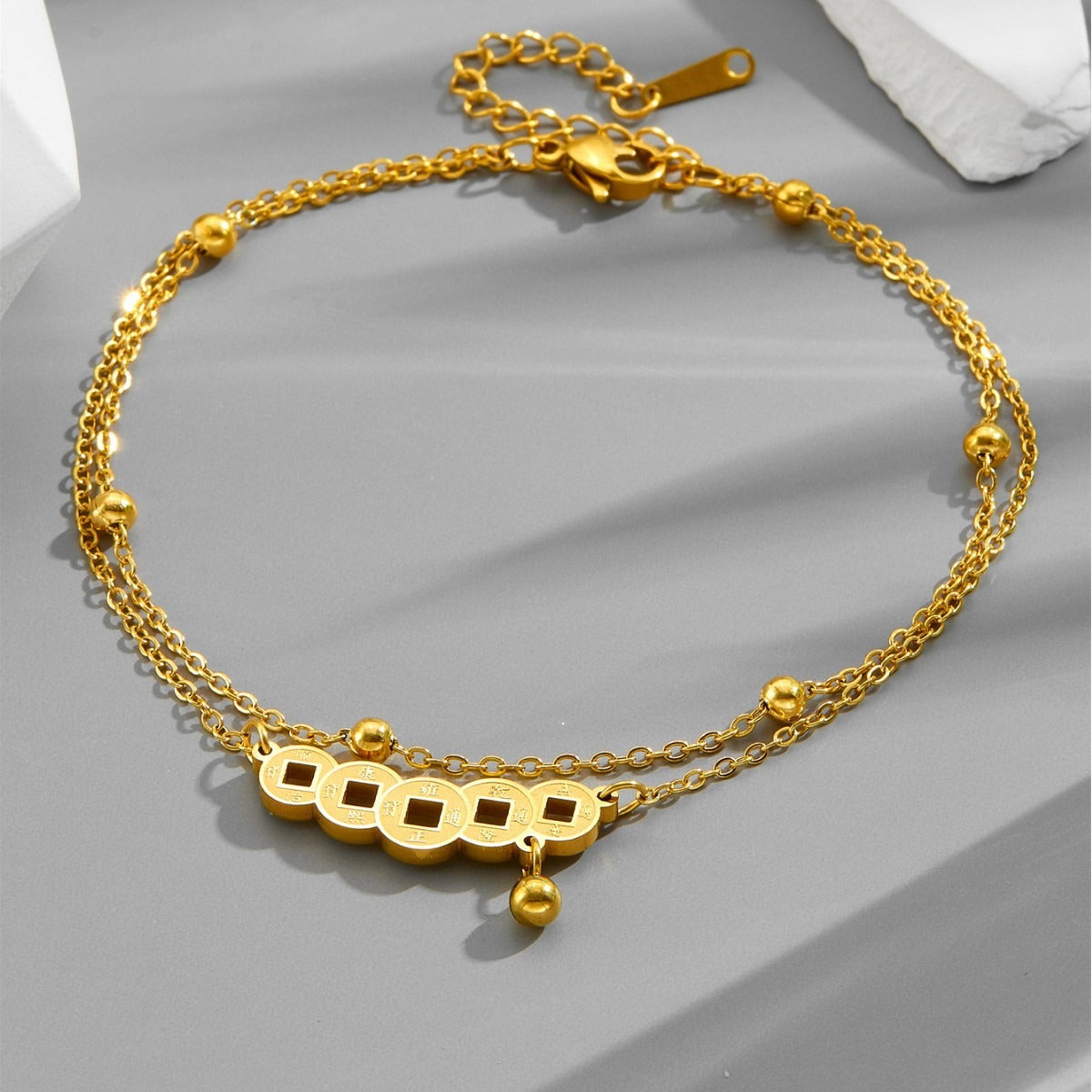 18k Gold Double-Layer Bead Chain Vintage Chinese-Style Copper Coin Anklet