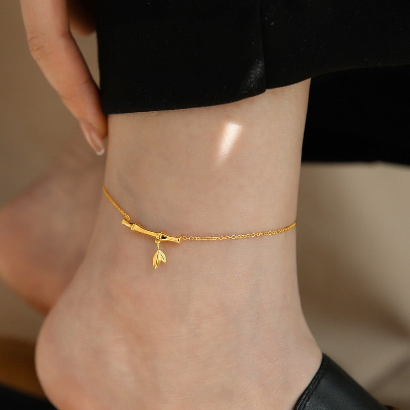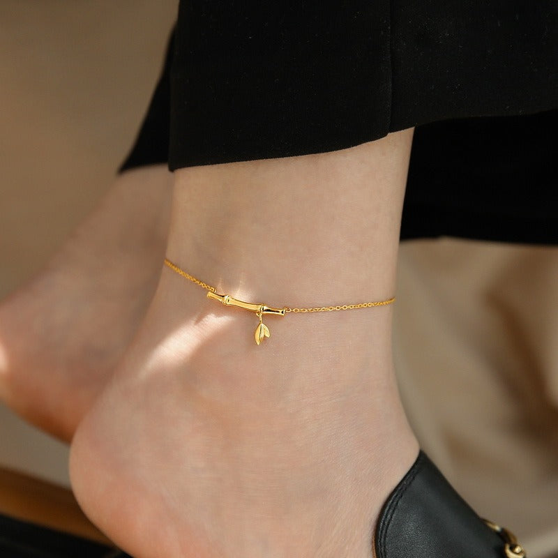 This anklet features 18K gold accents and a bamboo design, symbolizing continuous growth and prosperity. The lightweight, slender chain is connected to the delicate bamboo joints, creating a discreet yet stylish and elegant look that adds a natural, graceful touch to the ankle.