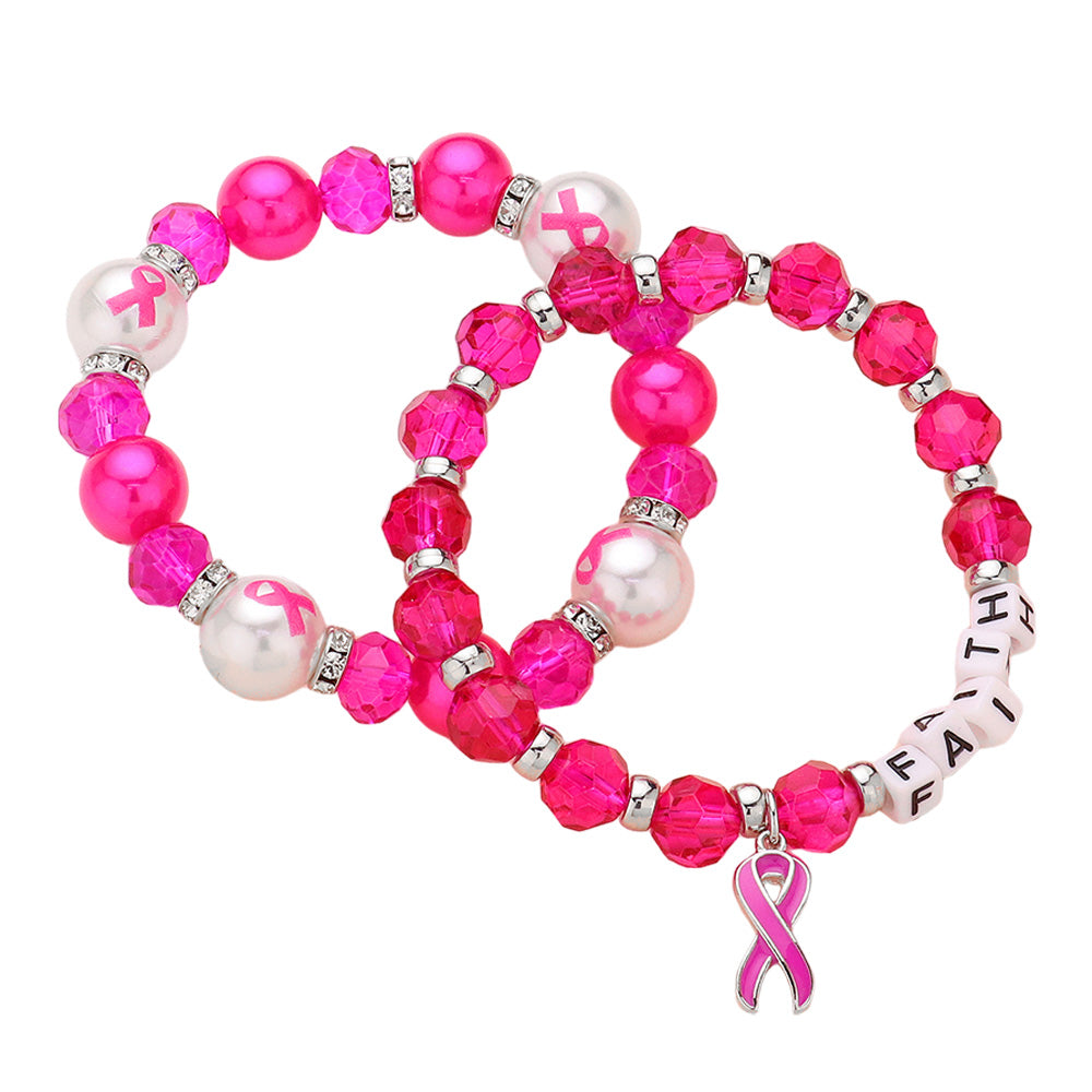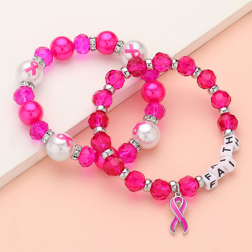 iLLASPARKZ 2PCS - FAITH Message Pointed Pink Ribbon Charm Faceted Beaded Stretch Double Layered Bracelets