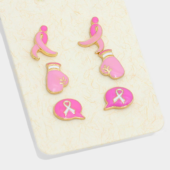 iLLASPARKZ 3 Pairs - enamel pink ribbon symbol & fight glove stud earrings