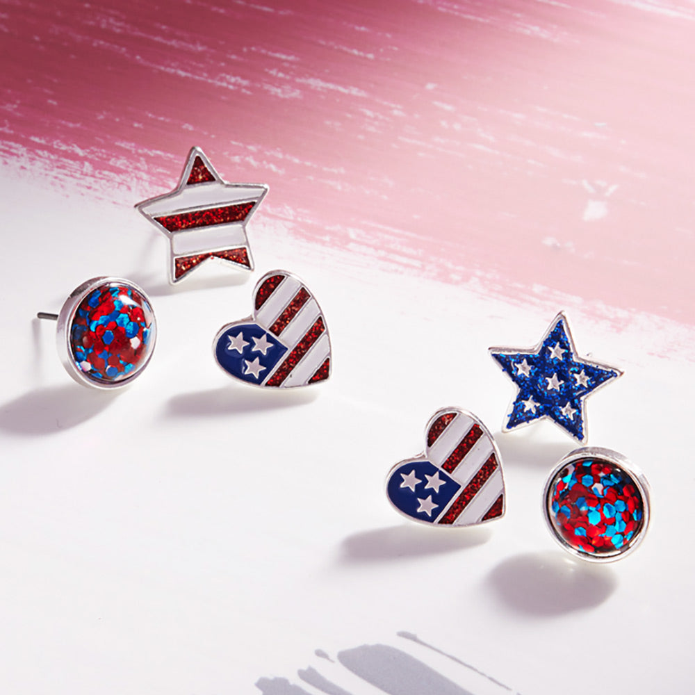 Show off your American pride with this festive stud earring set featuring stars, hearts, and flag motifs. A stylish patriotic jewelry collection perfect for celebrating national holidays and everyday flair.