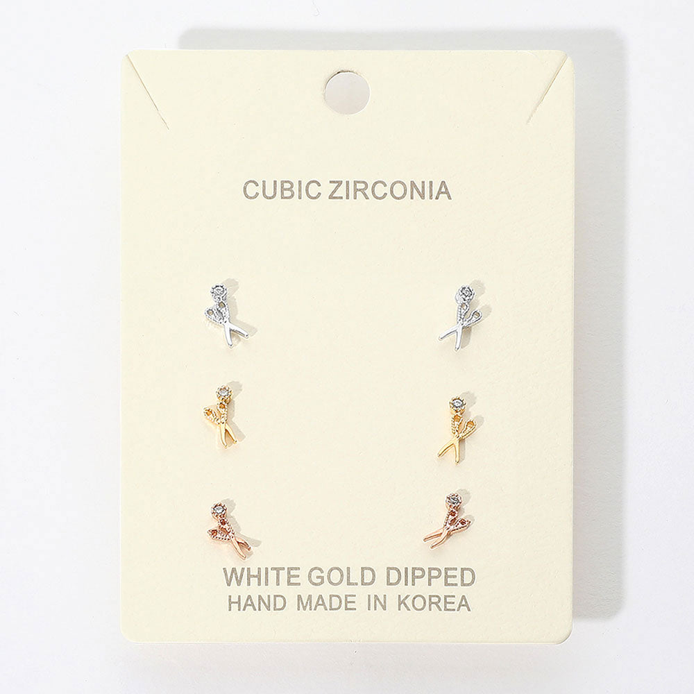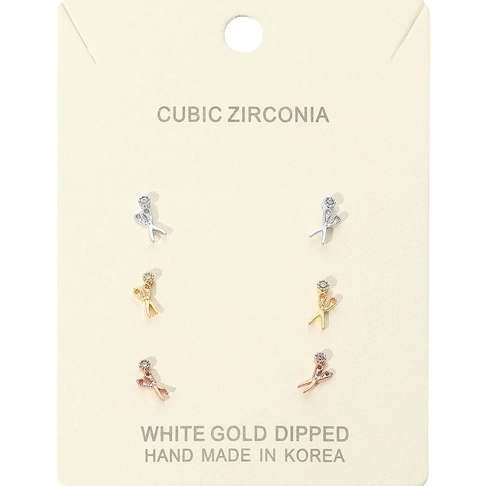 Delicate Scissor-shaped stud earrings featuring sparkling cubic zirconia accents. This elegant three-pair set offers a romantic touch, perfect for everyday elegance or thoughtful gifting.