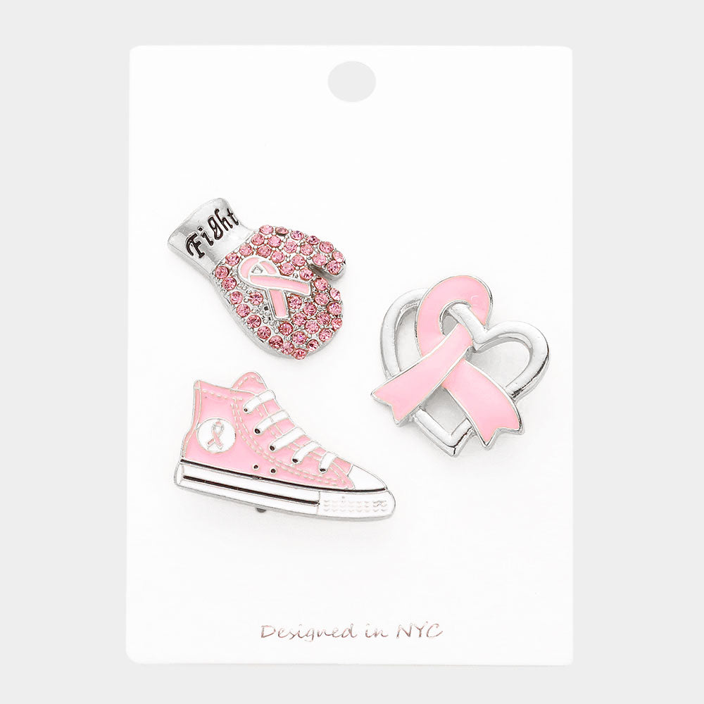 Three-piece enamel pin set featuring boxing glove, sneaker, and heart ribbon designs to show support and raise awareness. Great for bags, jackets, and gifts. Motivational and meaningful accessories.