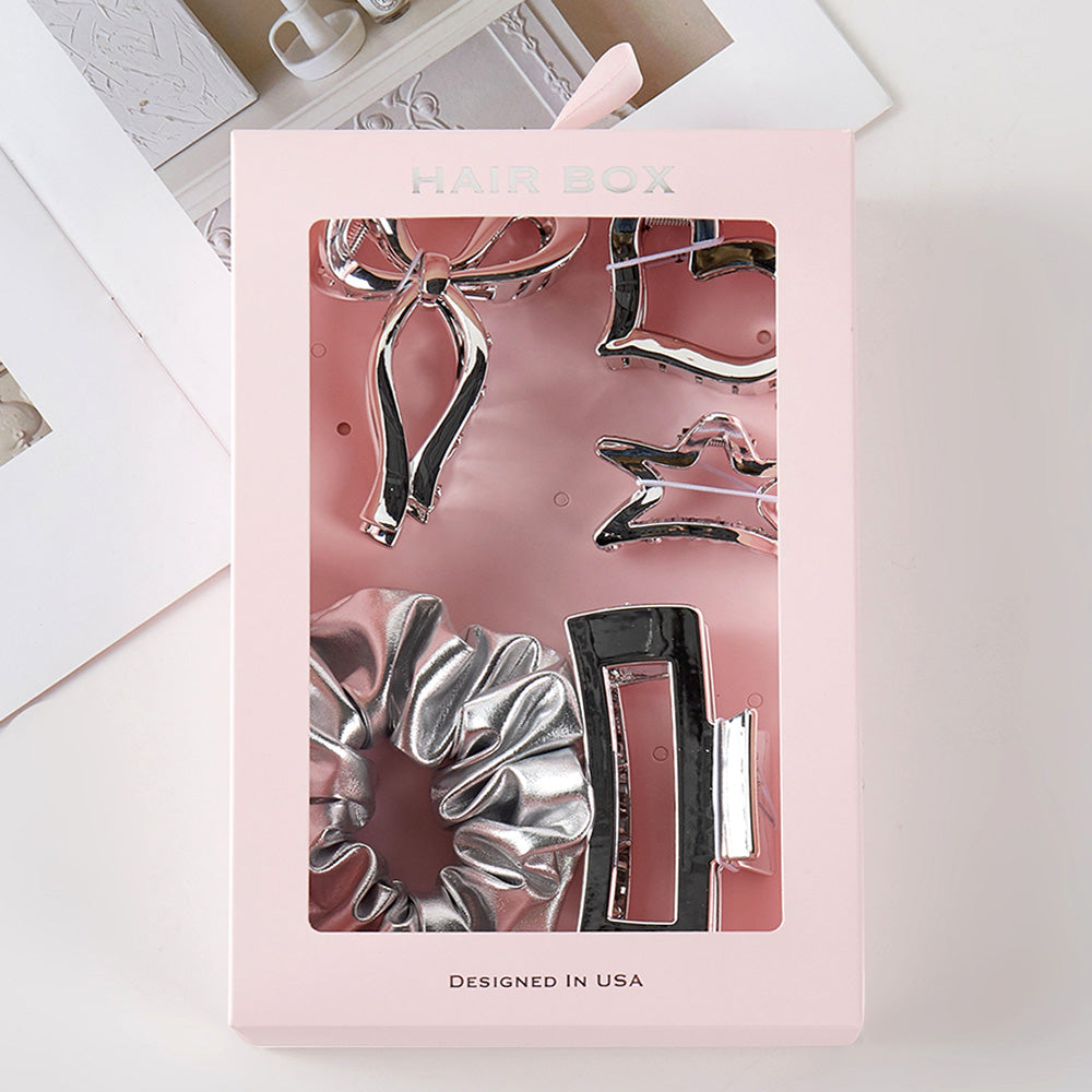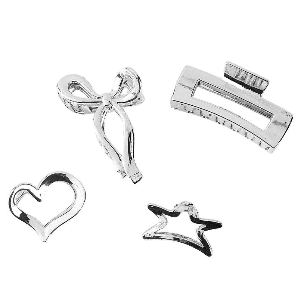 iLLASPARKZ 5PCS - Chrome Bow Heart Star Square Open Hair Claw Clips Stretchable Fabric Hairband Set