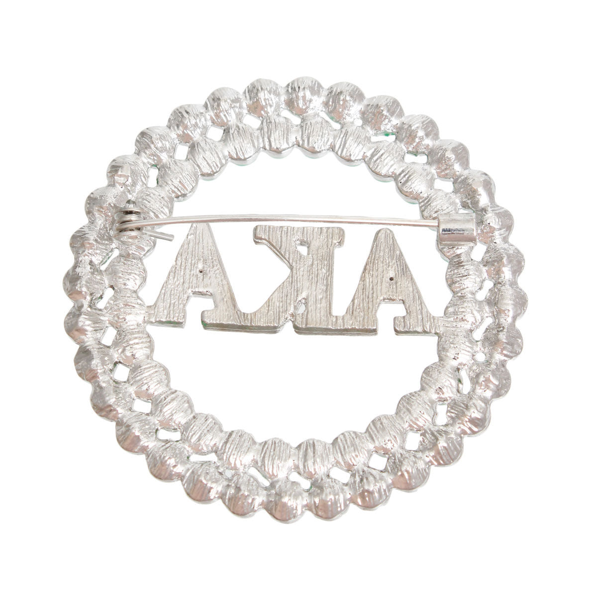 Women's Brooch Pin Featuring Round Circle Design with Silver Metal, Green Pearl Studs, Pink Rhinestone Edge, and AKA Alpha Kappa Alpha Detail. Safety Pin C Clasp Closure.