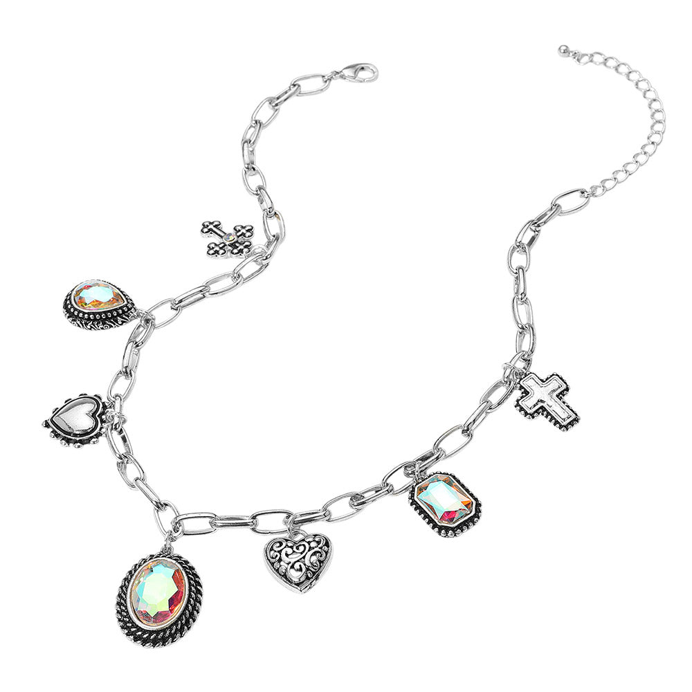 iLLASPARKZ Antique Metal Oval Teardrop Rectangle Stone Cluster Metal Heart Cross Charm Station Necklace
