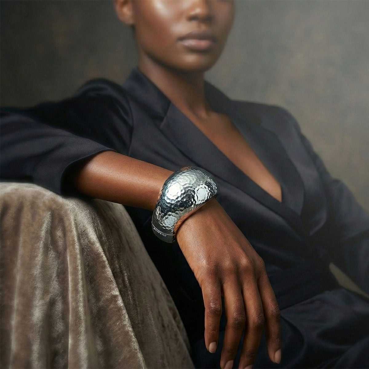 Women's Bangle Bracelet. Fashion Forward Contemporary Thick Chunky Hammered Texture Silver Metal Bangle Bracelet Featuring Wavy Shape Design. Hinge Closure. Bangle Inner Diameter Measures 2.5 inches. 10 inches Exterior Circumference. 1.5 inches Wide. Perfect for Stacking and Layering!