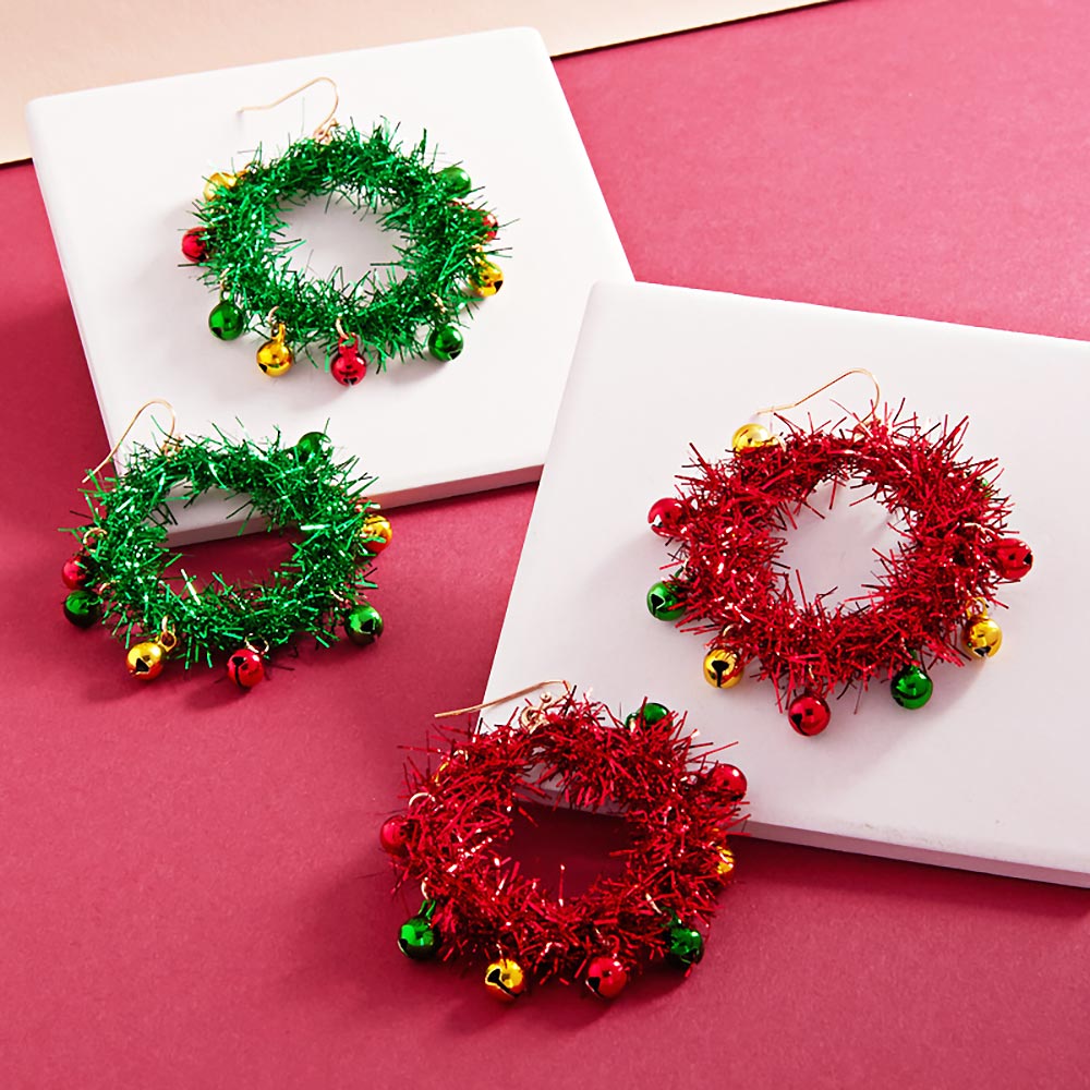 Bring festive flair to your outfit with these tinsel wreath earrings, decorated with playful jingle bell charms. Perfect for holiday events, seasonal parties, or adding cheer to everyday looks, these lightweight earrings offer a bold and joyful statement.