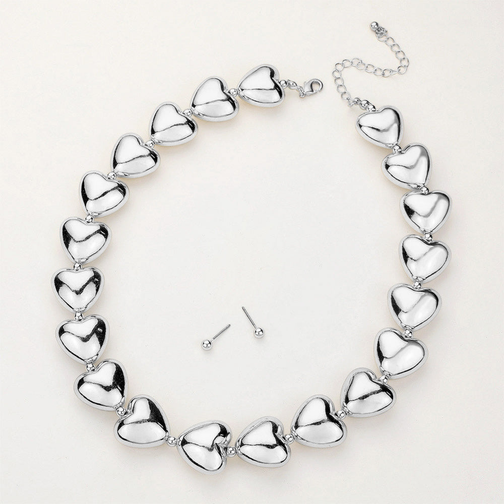 Statement necklace featuring bold heart links and matching stud earrings. A perfect accessory to add a romantic and stylish touch to your everyday or evening look.