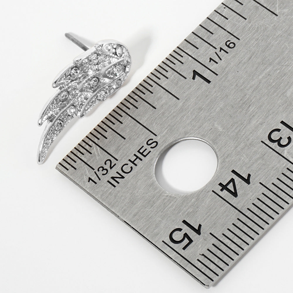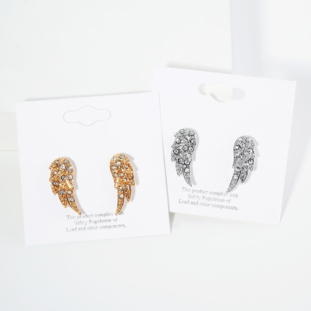 Chic angel wing stud earrings with crystal accents. A delicate and stylish touch for everyday wear or special occasions. Lightweight, modern design for a hint of sparkle and elegance.