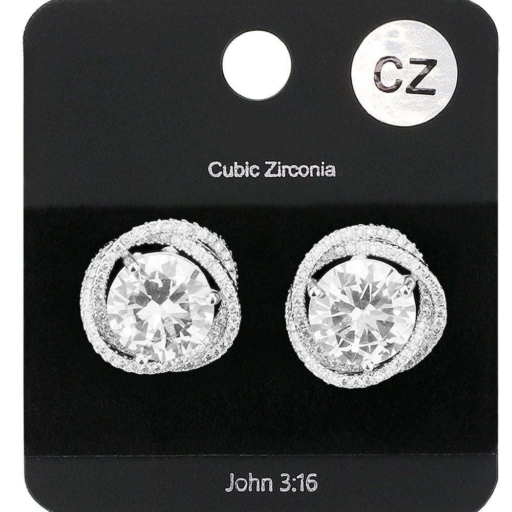 Elegant stud earrings with a round cubic zirconia center stone surrounded by a twisted halo of pavé accents. A refined yet eye-catching design, ideal for weddings, parties, or adding sparkle to any outfit.