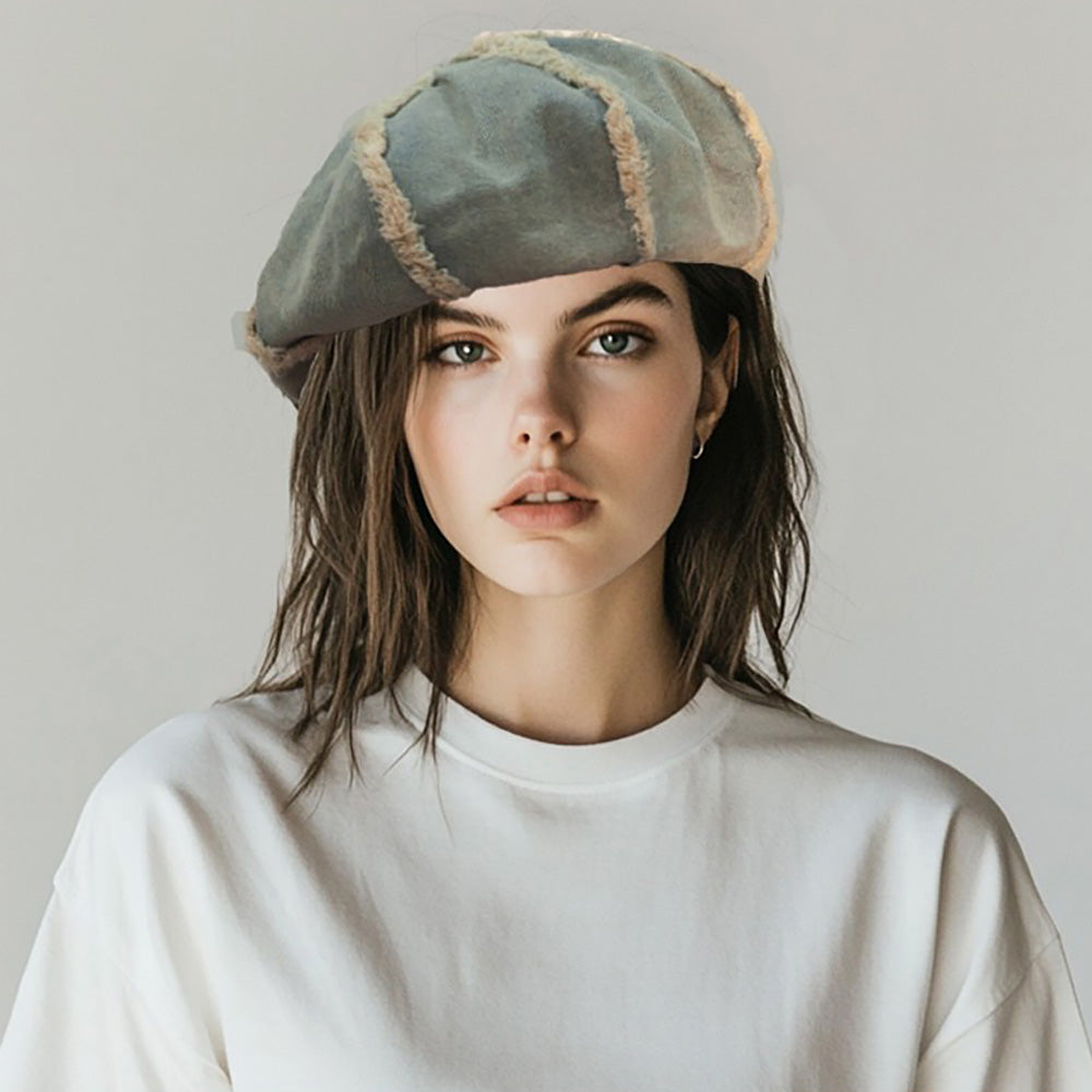 Soft cotton beret with vintage washed finish and panel stitching for a rustic look. Ideal for adding understated charm and artistic flair to casual and creative everyday outfits.
