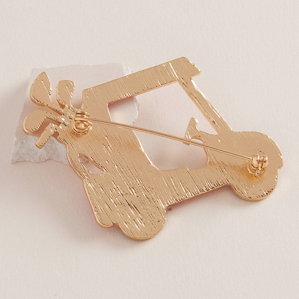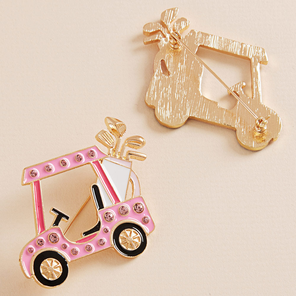 Stylish golf cart enamel pin featuring golf clubs and rhinestone details. A fun accessory for golfers, perfect for hats, bags, or lapels. Great gift for golf fans.