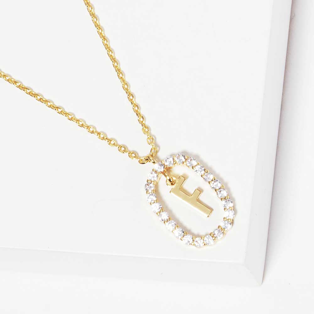 iLLASPARKZ -F- Gold Dipped Metal Monogram Rhinestone Oval Link Pendant Necklace