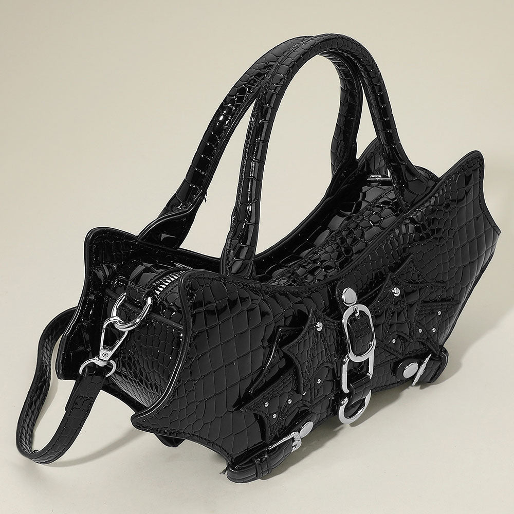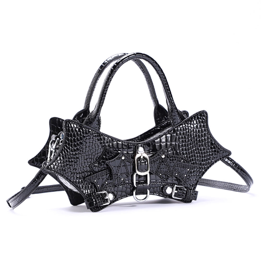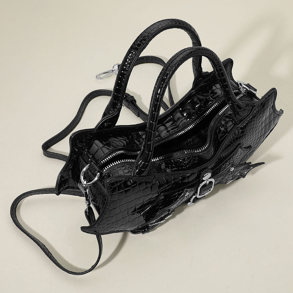 Elevate your gothic look with this black bat wing handbag! Features croc-textured faux leather, silver studs, buckle detail, and a dramatic winged silhouette. Perfect for alt fashion or Halloween vibes.