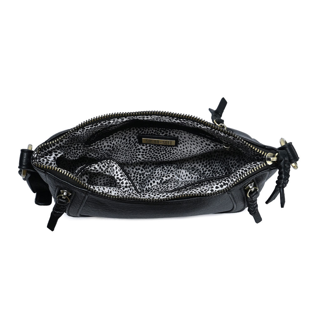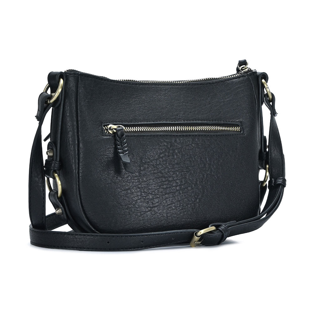 Functional crossbody bag featuring dual zippered front pockets, braided pull accents, and an adjustable strap for versatile wear. Designed for daily use with a compact, stylish profile and practical storage.
