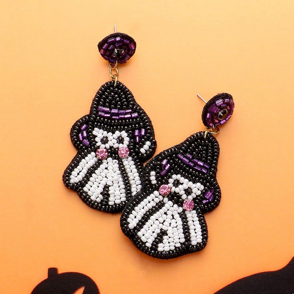 iLLASPARKZ Felt Back Seed Beaded Witch Hat Ghost Dangle Earrings