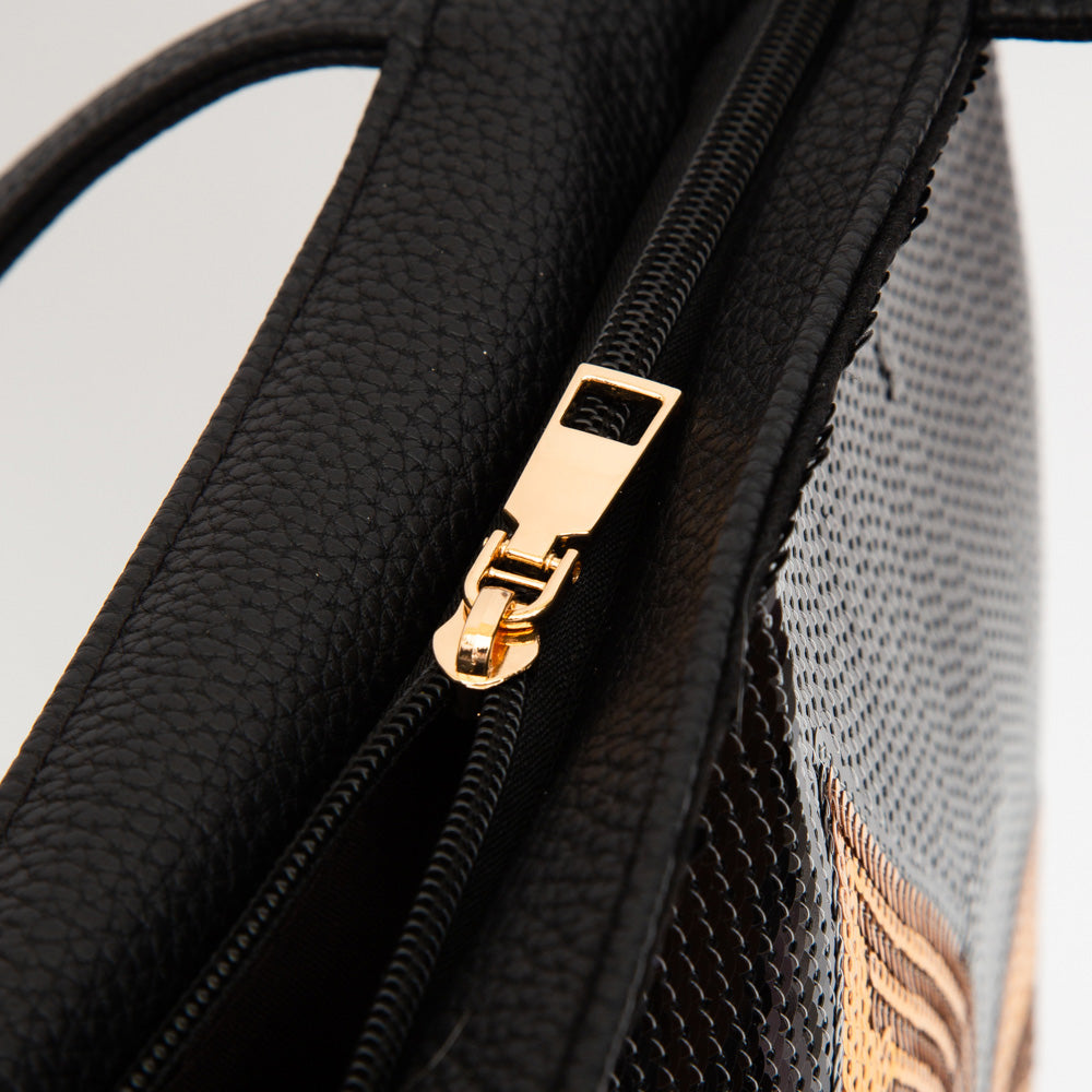 Eye-catching sequin Fleur-de-Lis tote bag with dual handles and spacious interior. A bold Mardi Gras or New Orleans-inspired accessory.