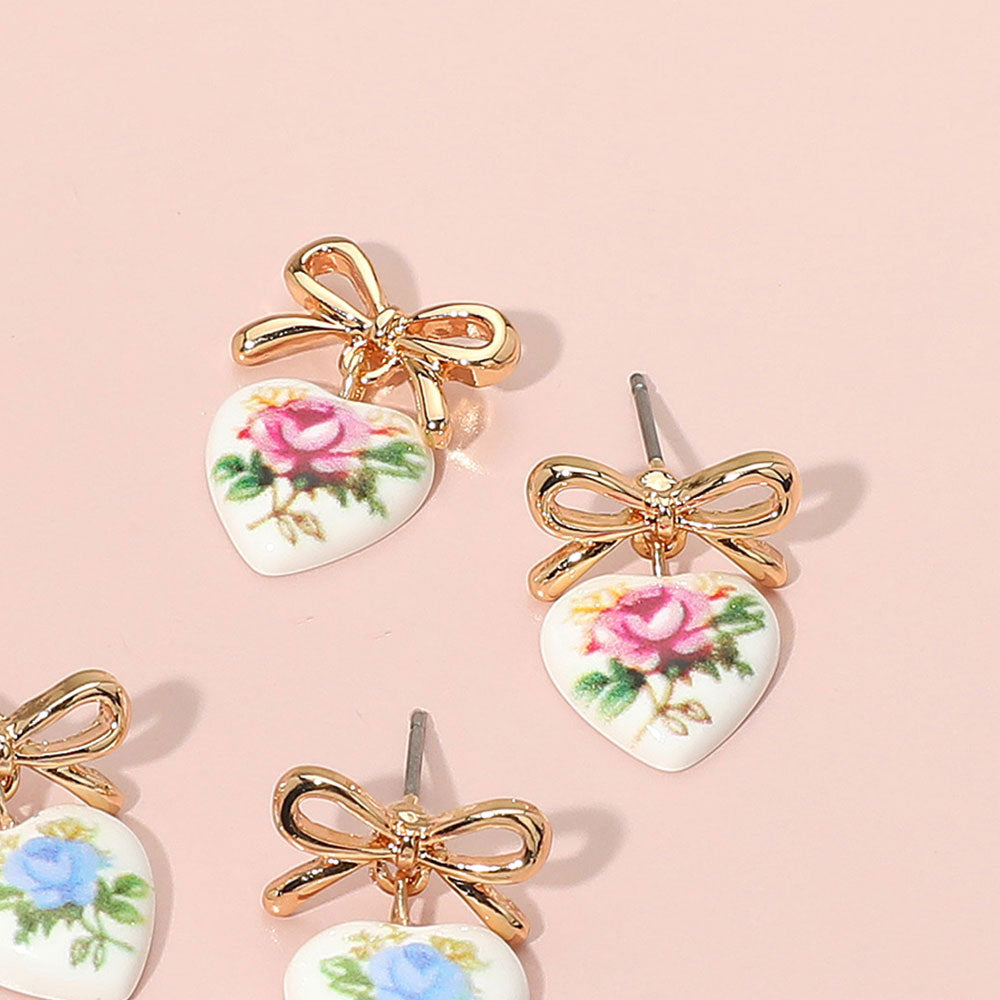 Elegant heart-shaped stud earrings with delicate floral porcelain inlays and classic bow accents—ideal for vintage charm and a feminine touch to any outfit or gift.