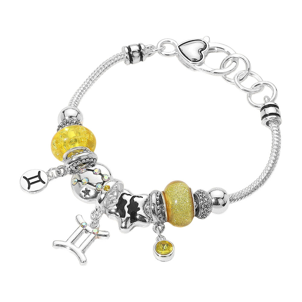 Celebrate your witty and versatile Gemini nature with this zodiac charm bracelet. Features the Gemini symbol, constellation, and celestial accents. A thoughtful gift or personal zodiac keepsake.
