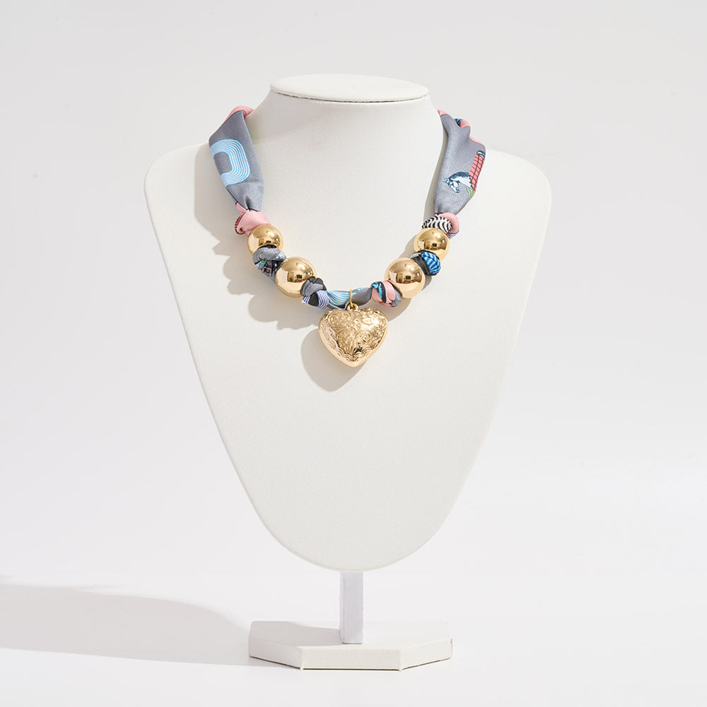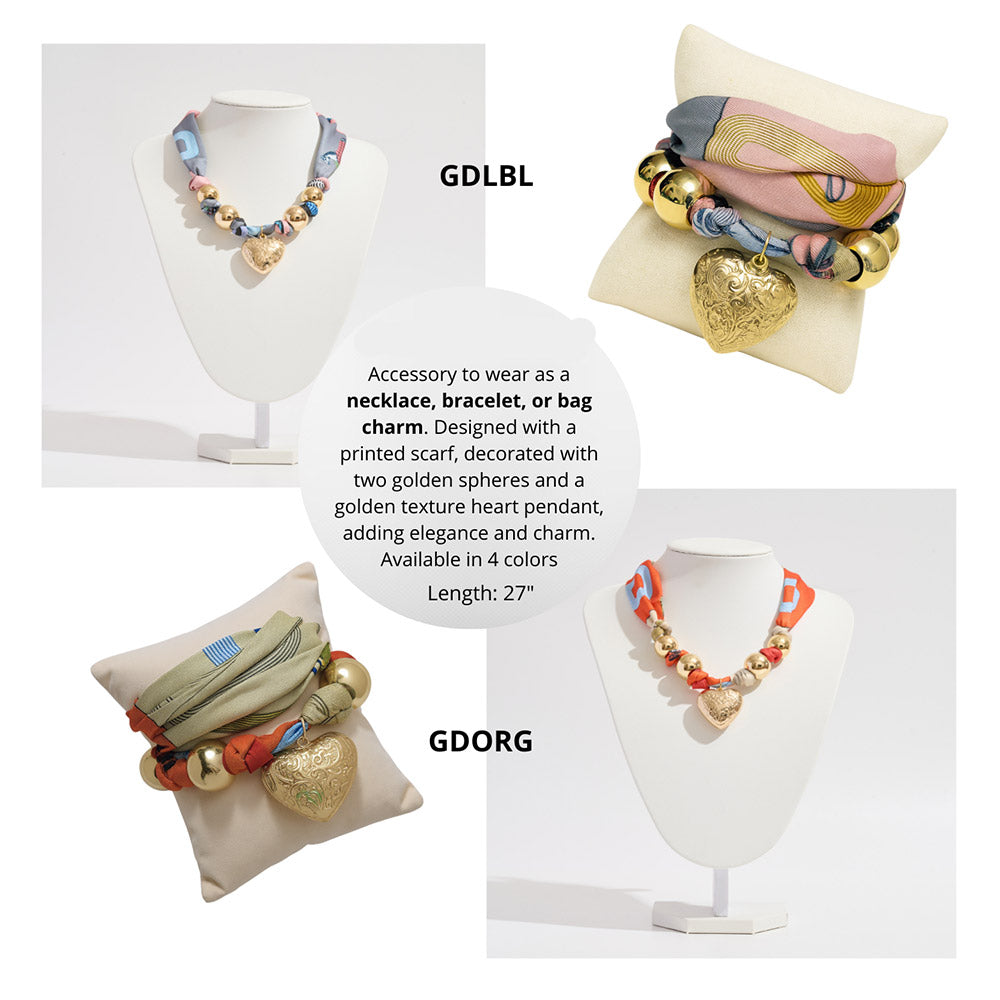 Versatile scarf accessory styled as a necklace, bracelet, or bag charm. Features a printed scarf with two bold spheres and a textured heart pendant for elegance and charm. Available in 4 unique designs to suit every look, this multifunctional piece adds sophistication.