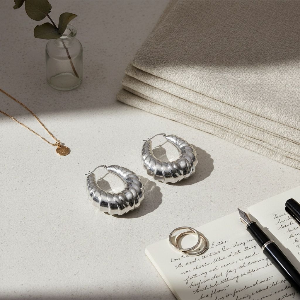 Women's Hoop Earrings. Modern Twist on a Classic Silver Metal Thick Hoop Earrings Featuring Teardrop Croissant Shape and Texture Design. Latch Closure.