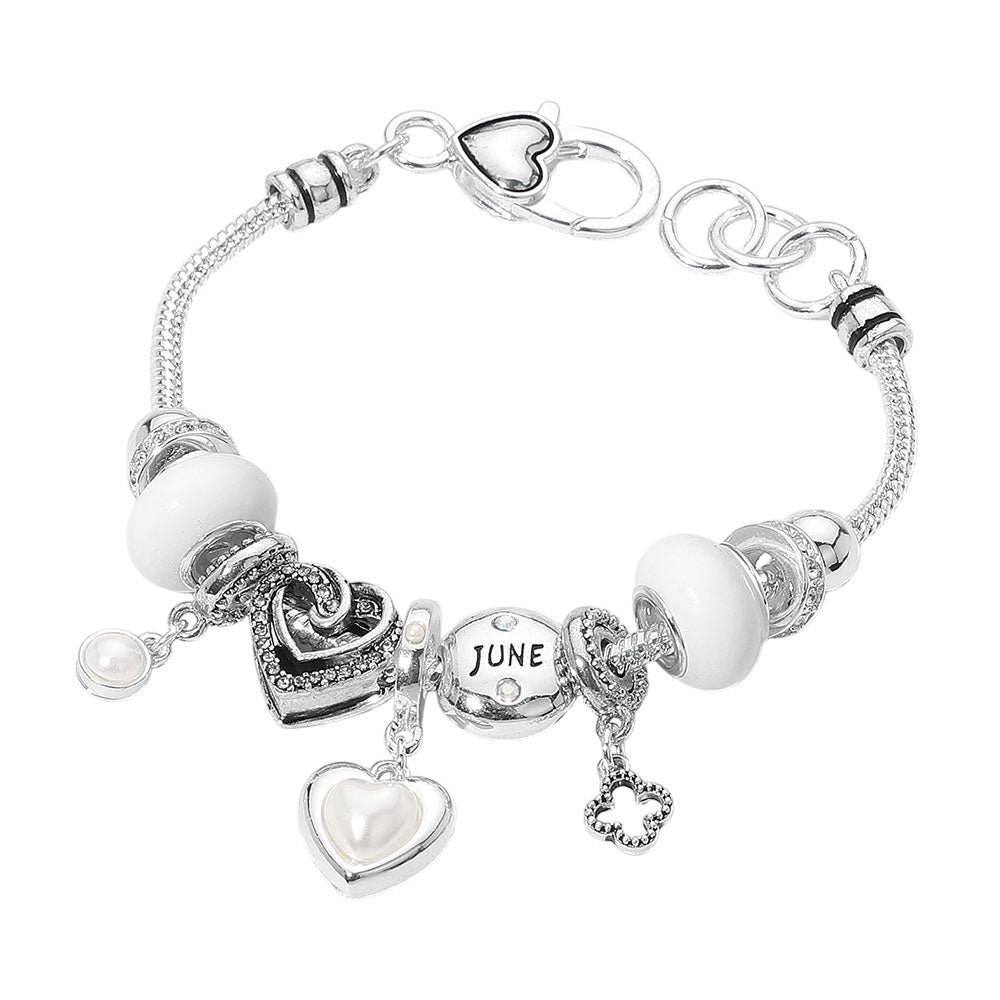 Honor June birthdays with this elegant charm bracelet, adorned with heart and bead charms. Representing balance and joy, it's a thoughtful accessory or gift to celebrate the beauty of the birth month.